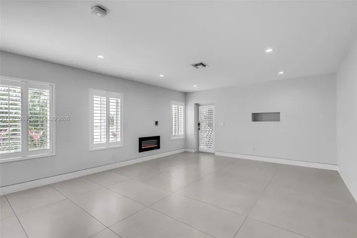 The designer kitchen features quartz countertops, floating soft-close cabinetry with pantry storage, and stainless steel Samsung appliances. Beautiful 24×48 porcelain tile floors flow throughout the home, complemented by recessed baseboards, solid core doors, and dimmable LED recessed lighting for a sleek contemporary finish.