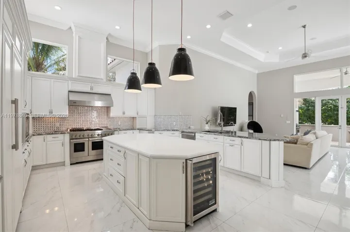 The features a great movie room and showcases a gourmet kitchen appointed with premium Viking appliances. Additional features include a private executive office, hurricane-impact windows and doors, a dedicated home theater, and advanced water systems including softening and reverse osmosis filtration.