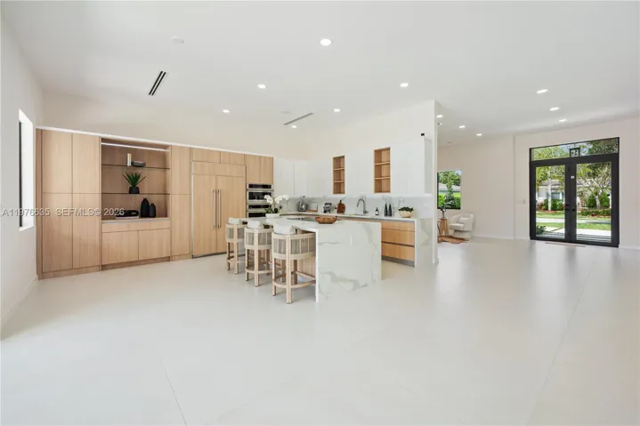 No detail has been spared. The home features custom cabinetry, impact glass windows and doors, a built-in sound system, beautifully curated interiors, a custom kitchen with Monogram appliances, and a sun-drenched saltwater pool. The spacious floor plan includes a dream-worthy primary suite with an oversized walk-in closet and a luxurious spa-inspired bathroom. All bedrooms are en-suite, providing comfort and privacy for family and guests.