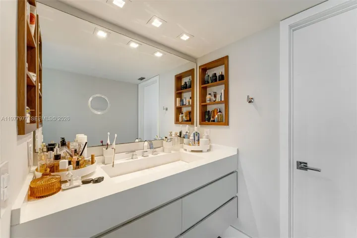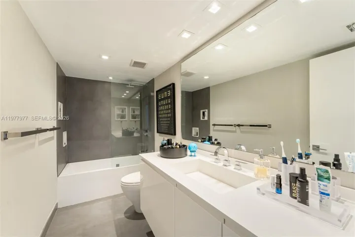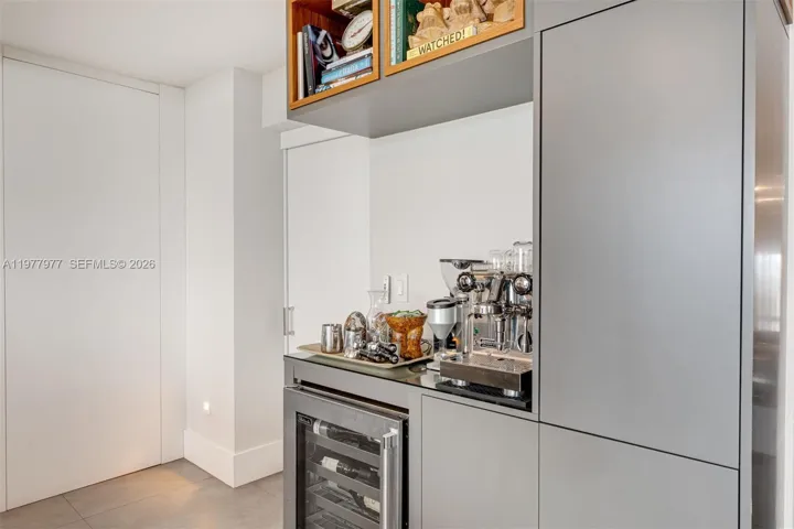 The residence has been thoughtfully redesigned with high-quality materials and custom finishes throughout. The open kitchen features a modern island with a built-in floating dining table, creating a stylish and functional space for everyday living and entertaining, complemented by high-end appliances. The living room includes a custom wall entertainment center that enhances both design and functionality.