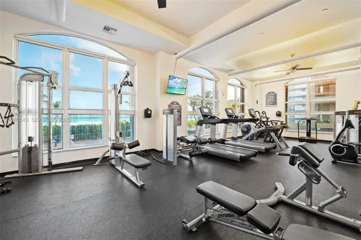 Residents enjoy direct beach access with chair and umbrella service and resort-style amenities including a heated pool, jacuzzi, upgraded fitness center overlooking the ocean, tennis court, sauna, BBQ area, and 24-hour attended lobby. Maintenance fees include cable and internet.