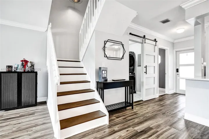 The updated kitchen features white shaker cabinetry, quartz countertops, stainless steel appliances, and modern backsplash, opening to the main living and dining areas. Upstairs you’ll find a large primary suite with custom closet built-ins and an updated bathroom, plus two additional bedrooms and full bath.