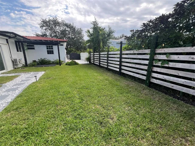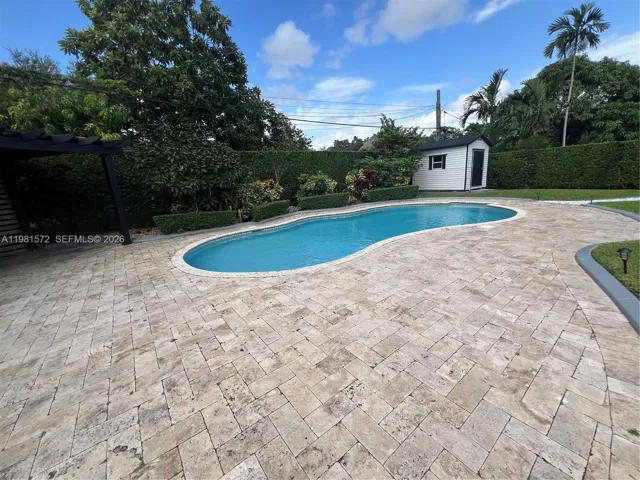 a 10,800 square feet lot. One of the bedrooms has a private entrance with its own bathroom. The home is secured with impact windows and doors for peace of mind and storm protection. This home features updated kitchen and bathrooms, dual rain shower, new flooring, smart appliances, a coffee station with a wine cooler, central AC, and various other updates. Spacious backyard with pool, outdoor shower and beautiful sitting area nestled under a pergola. Plenty space for entertainment.