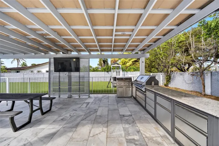 The living areas flow seamlessly into a spectacular outdoor retreat featuring a breathtaking athletic infinity-style pool surrounded by beautifully designed entertainment areas. Enjoy gatherings under the custom pergola and outdoor kitchen while overlooking the expansive backyard with a turf playground area and a custom 12×30 storage shed.