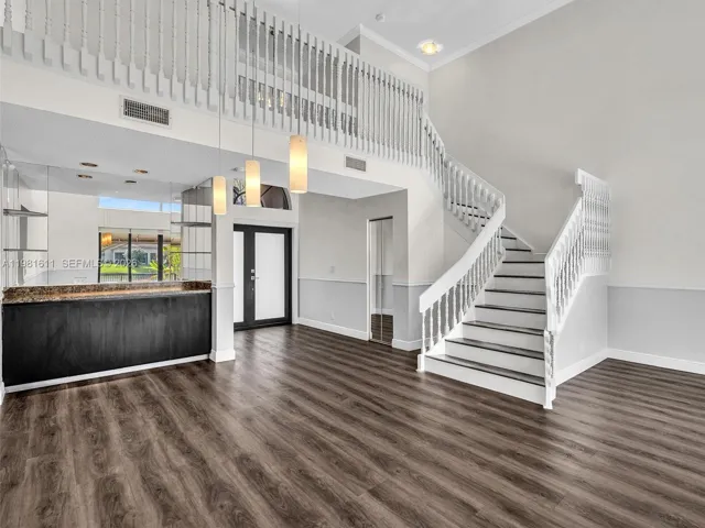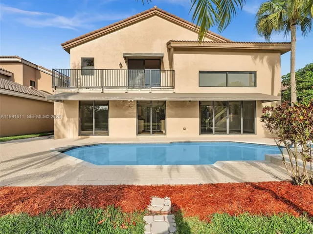 Waterfront living with wide lake views in a quiet Plantation neighborhood. This 4-bedroom, 3-bath home features vaulted ceilings and a bright, open layout designed for comfortable living and entertaining. Impact windows and impact glass front doors provide added protection. The backyard overlooks the lake and includes a heated pool and spa, creating a great setting for outdoor living. Brand-new pool heater (2026). A first-floor bedroom and cabana bath offer flexibility for guests or multi-generational living. Interior features include fresh paint in the great room and bedrooms, custom closets, and a bar area in the great room. Custom awnings extend from the kitchen, family room, and primary bedroom balcony. Garage includes a newly painted floor, new wall-unit A/C, refrigerator that conveys, and wire storage racking. Located in a non-gated community with sidewalk-lined streets and recent swale tree replacements.