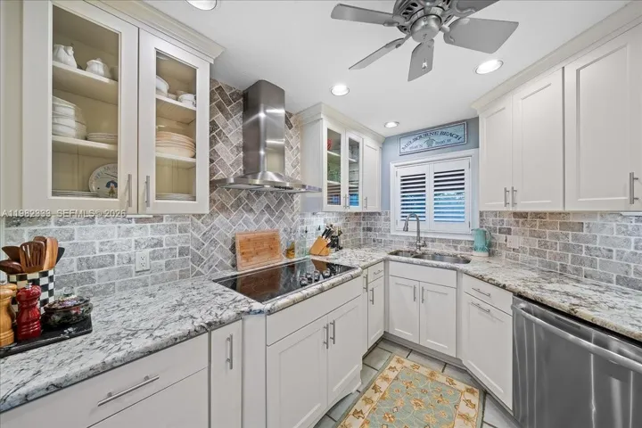 Inside, beautifully renovated interiors showcase refined finishes throughout. Oak flooring, custom trim, wainscoting, and shiplap ceilings highlight the craftsmanship. The updated kitchen features granite countertops, stainless appliances, wall ovens, and a wet bar—perfect for entertaining. Two-story cathedral ceilings and expansive windows flood the living and dining areas with natural light and stunning river views. A new electric fireplace warms a cozy alcove that flows seamlessly into a 240-square-foot screened porch. All three bedrooms offer en-suite baths and walk-in closets with custom storage, creating comfort and privacy for family or guests.