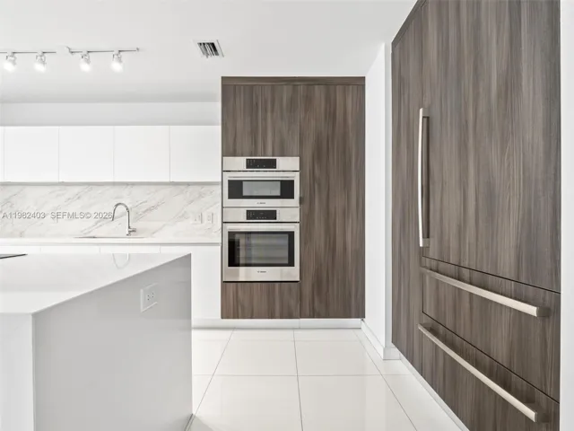 Modern European-style kitchen with quartz island, sleek cabinetry, stone backsplash, and premium Bosch appliances.