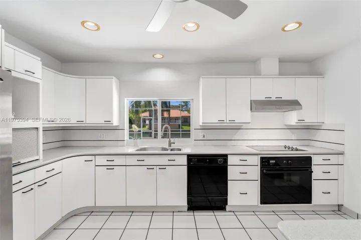 Nestled in the gated community of Gables by the Sea, this 4 bd 3 ba canal-front residence offers 100′ of freshwater on a 12,300 sf lot with a circular brick driveway, creating a peaceful setting surrounded by lush landscaping & mature palm trees. This light-filled home offers an opportunity to refresh the existing charm of this well-constructed 1972 ranch style beauty. The floor plan includes 2 ensuite baths & generously sized closets. The gracious foyer entry welcomes you to formal living & dining areas & a family room w/direct pool/veranda access. The spacious white kitchen features a convenient pass-through bar opening directly to the pool/veranda & ready for new owner personal touches. Additional highlights include impact glass & custom plantation shutters. A 2-car garage includes a laundry area with washer/dryer & utility sink. Outdoor living is peaceful & inviting, featuring a screened 30×15 pool overlooking the freshwater canal, a veranda w/ceiling fans, & cabana bath for added convenience. The lush yard offers plenty of green space to relax & play while enjoying tranquil waterfront views. The private seawall and dock create the perfect launch point for paddle boarding, kayaking, or canoeing on the freshwater. No ocean access. Ideally located near the area’s finest parks, marinas, and amenities. Residents of the gated community also enjoy a neighborhood park with a playground, gazebo for gatherings, open grass field, and basketball court, all near top-rated schools.