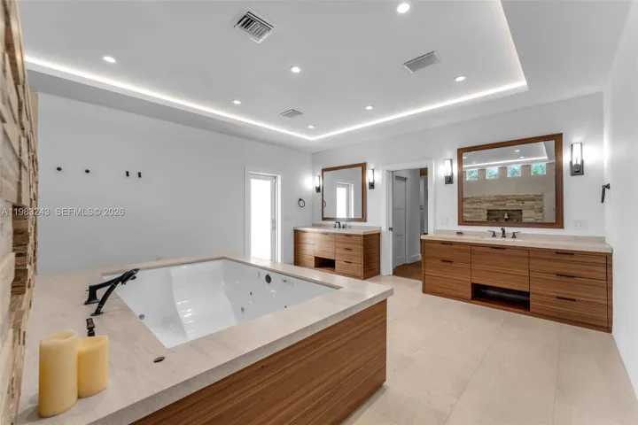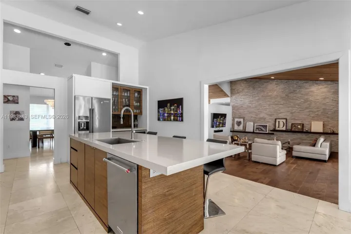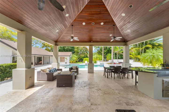 Welcome to Country Grove Estates — an exceptional custom residence set on approximately one acre on a rare double cul-de-sac. This impressive estate features 5 oversized bedrooms, 4 bathrooms, and over 4,401 sq ft (5797 of adjsft) of elegant living space designed for comfortable family living and grand entertaining. The outdoor experience sets this property apart. A ±1,500 sq ft covered entertainer’s pavilion anchors the backyard and features a traditional Argentine grill alongside a fully equipped outdoor kitchen with gas grill, cooktop, sink, refrigeration, ice machine, and prep space. The resort-style pool with Jacuzzi, professionally lighted ~2,400 sq ft basketball court, and lush tropical landscaping transform the property into a private retreat. Inside, dramatic vaulted wood ceilings and full impact glass fill the home with natural light while providing security and energy efficiency. Living and dining areas flow into the home’s gathering spaces.The primary suite includes a spa-inspired bathroom with a two-person Jacuzzi set against a natural rock accent wall with custom ambient lighting and built-in audio.Additional highlights include a chef’s kitchen with top-of-the-line appliances, breakfast nook, an entertainment room with HD projector and retractable 122-inch screen, and smart-home features with app-controlled lighting and whole-home Sonos audio.