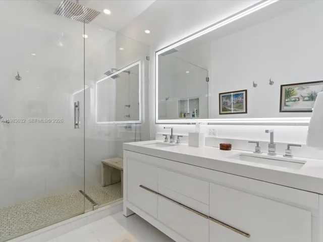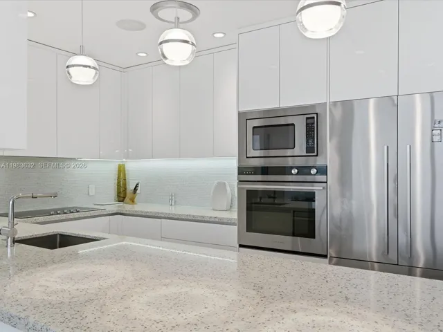 Residence features include white porcelain flooring, built-in drop-down movie screen, surround sound system, TVs throughout, and in-unit washer and dryer. Offered fully furnished with designer pieces, this is an ideal turnkey residence for full-time living, seasonal use, or investment.