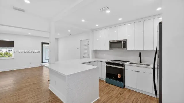 Interior highlights include updated bathroom, new impact windows and doors, new interior glass doors, new Wood Grain Viny floors throughout and recessed LED lightening. The electrical and plumbing systems have been updated.The open concept kitchen with ample storage is designed for modern living, showcasing a large quartz peninsula,sleek finishies and brand new appliances.