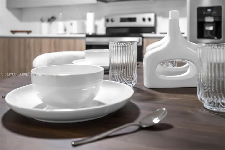 The apartment includes an in-unit laundry area for added convenience and everyday comfort. The open-concept kitchen is fully equipped and designed to inspire, with ample cabinetry and counter space, perfect for cooking and entertaining while feeling like a true chef. The layout seamlessly connects the living and dining areas, making it ideal for both relaxing and hosting guests.
