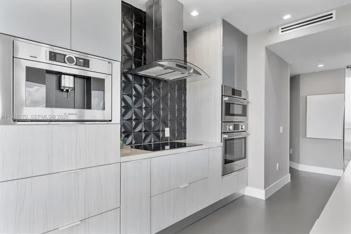 Completely renovated 2 bedroom, 2 bathroom corner unit on the 43rd floor, featuring floor-to-ceiling windows, open-concept layout, wraparound balcony with panoramic views of the ocean, Miami skyline, La Gorce Golf Club, and both sunrise and sunset views. Fully remodeled, move-in ready luxury condo with high-end upgrades including modern lighting fixtures, electric shades, custom-designed kitchen with Bosch stainless steel appliances, built-in coffee machine and wine storage.