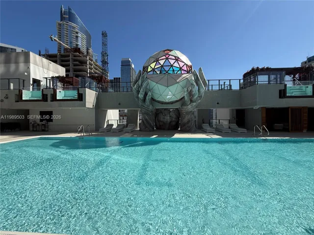 Residents enjoy a full-service lifestyle 24/7 with amenities including a modern lobby, curated art installations throughout the common areas, a sports lounge with stadium-style seating and LED video wall, a fitness center, spa and wellness spaces, yoga and meditation areas, bar and lounge, and a multi-level pool deck with cabanas overlooking the city.