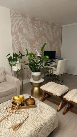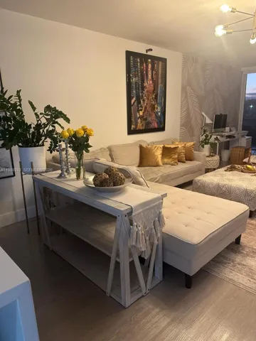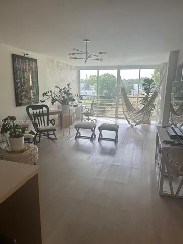 The apartment features a spacious and modern layout with a beautifully upgraded kitchen as its focal point. The quartz waterfall countertop adds both function and design, opening into a bright living area that feels comfortable and refined. Light wood-look flooring runs throughout, creating a clean, elegant base that works with any style.