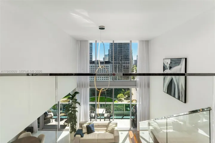 Step from your semi-private elevator into a space defined by soaring ceilings and soaring walls of impact glass. Flooded with natural light, the home features professional curation by Addison House and Natuzzi. The rare 3BR/2.5BA layout (including a seamless den conversion) is finished with sleek porcelain tile and a fully integrated Smart-Home ecosystem, controlling lighting, climate, and multi-room sound via built-in speakers. The designer kitchen is a culinary dream, boasting Snaidero cabinetry and top-tier appliances.