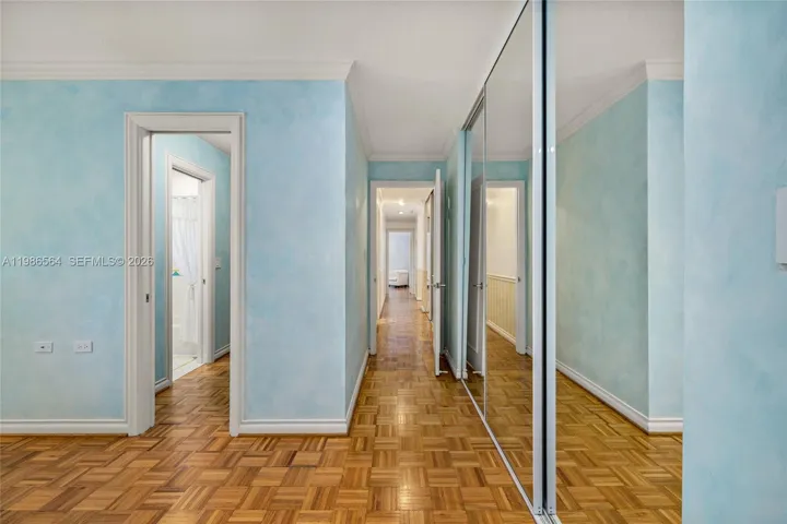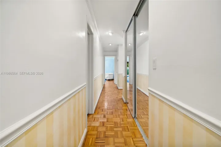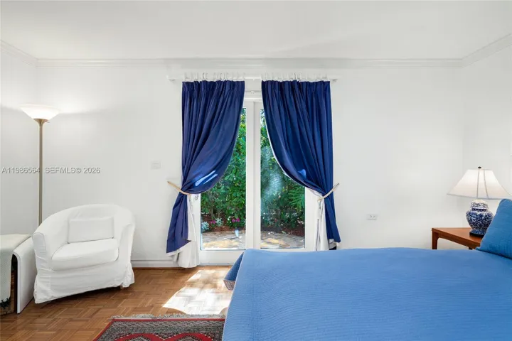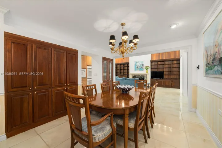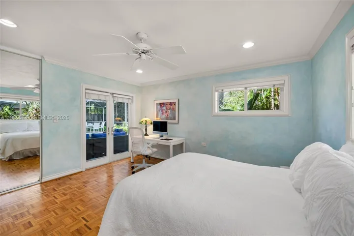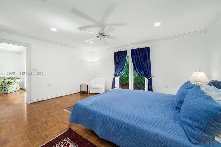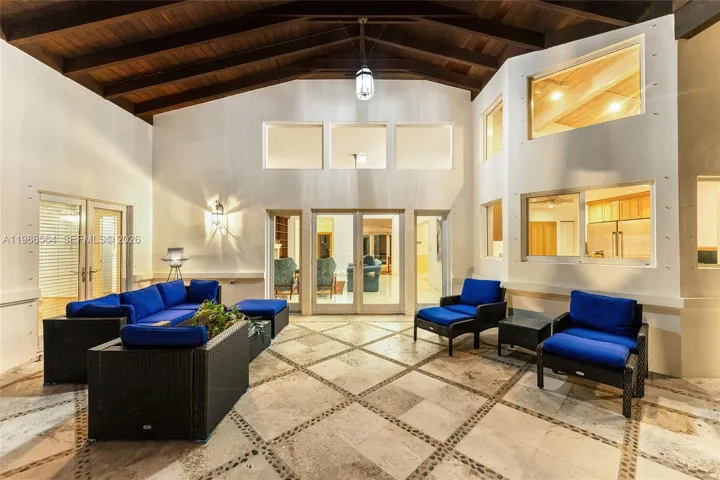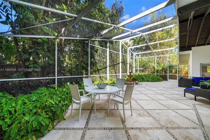 This beautiful villa-style residence in Key Biscayne sits on charming Cranwood Drive, a quiet, residential street lined with mature oak trees near the Village entrance. Home offers 5RB/4BA, including a staff BR with ensuite bath and private entrance. Interior features include classic Cuban tile and parquet hardwood floors, French doors, Thermopane windows, LED lighting, and custom designer millwork. The home presents 3,077 total SF on an elevated 10,007 SF gated lot with wood fence and custom Dade County pine gate. Mature tropical landscaping surrounds the property, and a brick walkway leads to the welcoming fountain entry. Outdoor features include a free-form Bisazza glass pool with 32-ft lap lane and a spacious screened patio lounge with a fountain for a true indoor-outdoor experience. Inside, the spacious living room boasts high ceilings, custom millwork, a wood-burning fireplace, and direct patio lounge access. A private dining area sits next to the gourmet kitchen with a pitched wood-beamed ceiling, large center granite island, top-tier Electrolux, Whirlpool/Profile appliances, plus a breakfast area with a stained-glass window. The private principal suite includes a flexible office/den space, walk-in closet, ensuite bath, and garden access. Three additional bedrooms, including a private guest suite, all overlook lush gardens. This rare offering combines privacy, tropical charm, and exceptional living in one of Key Biscayne’s most desirable locations.