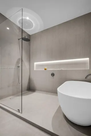 The primary suite is a private retreat, complete with a spa-inspired bath showcasing Calacatta quartz, dual vanities, a soaking tub, and a glass-enclosed shower. Floor-to-ceiling impact glass doors extend the living experience outdoors to a lush, private setting.