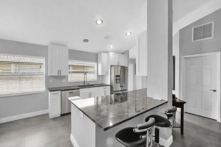 A great opportunity on a well-maintained 2BR/2BA villa in highly desirable Palm Beach Bath & Tennis! Flexible layout with lots of possibilities featuring over 1,450 sq. ft. of bright, comfortable living space in a gated, all-ages, pet-friendly community. Home features a beautiful modern kitchen with granite countertops, newer stainless steel appliances spacious living and dining areas, an additional family room, vaulted ceilings, and a desirable split-bedroom floor plan. The primary suite offers wood floors, a large walk-in closet, and an ensuite bath with double vanity, shower, and soaking tub. Additional highlights include a dedicated laundry room and 2-car garage. Prime location, FHA and VA approved, with resort-style amenities including pool, spa, clubhouse, exercise room, tennis, and basketball courts. Prime location and best value in the area. See Broker Remarks.