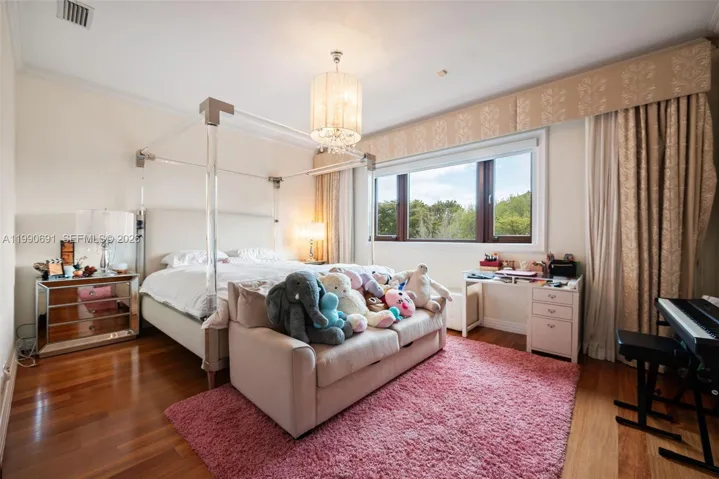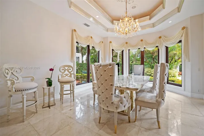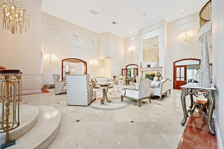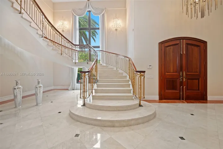 Elegant Mediterranean estate on a prime corner lot in Coral Gables, offering 8,956 SF of living space on an expansive 43,732 SF lot with three separate entrances for ultimate privacy and convenience. This impressive residence features 7 bedrooms, 8 full bathrooms, and 3 half baths, along with a private office and a dedicated bar room designed for entertaining. Grand interiors are highlighted by soaring ceilings, a sweeping staircase, and expansive living areas, including two formal dining rooms. The primary suite is a true retreat, spanning approximately 1,300 SF with dual walk-in closets and a private balcony overlooking the pool and lush grounds.