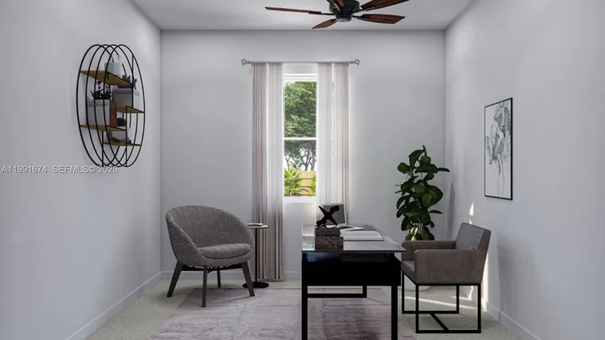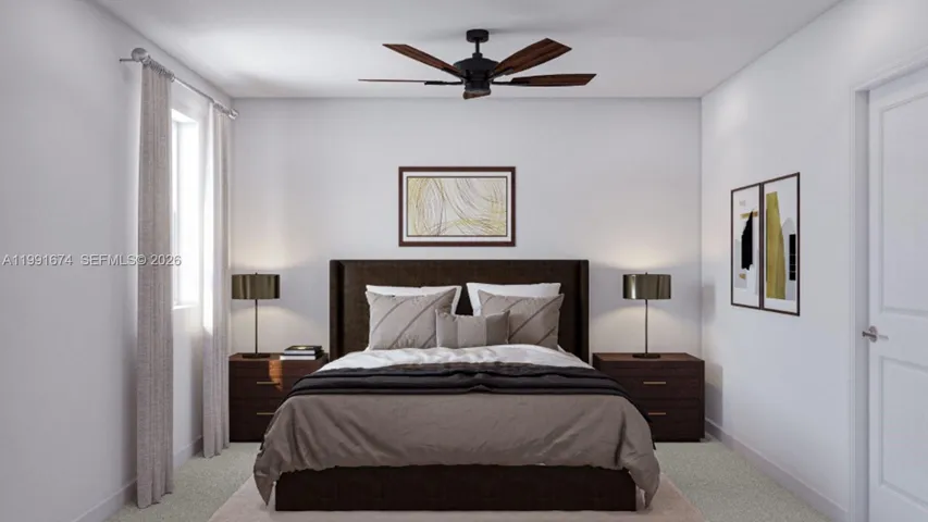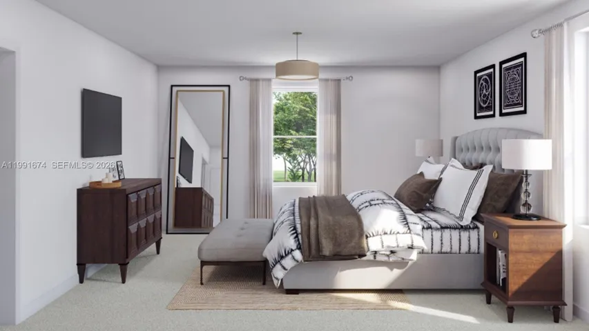 Upon entry of this spacious two-story home with impact-resistant windows is a living room ideal for entertaining guests, followed by the kitchen, family room and dining room arranged in a desirable open floorplan that promotes seamless transitions between spaces. A first-floor bedroom is well-suited for versatile uses and the remaining four bedrooms occupy the second floor, including the luxe owner’s suite with a spa-inspired bathroom.