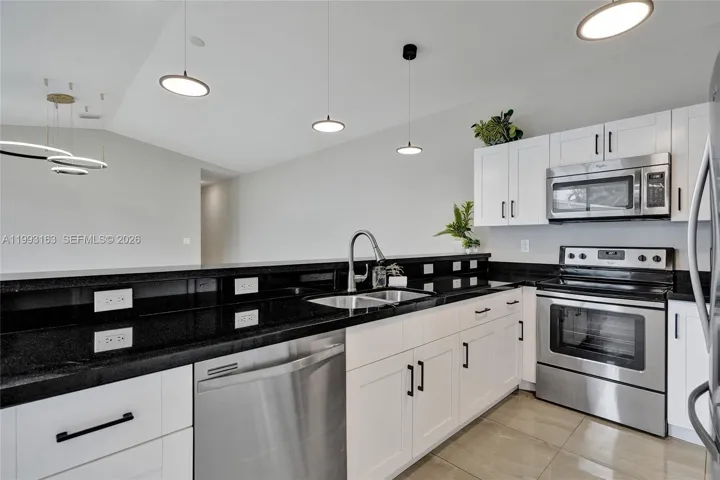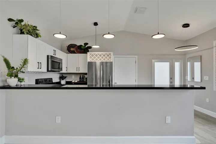 vaulted & volume ceilings. Open kitchen, with modern-style cabinetry, stainless steel appliances, black quartz