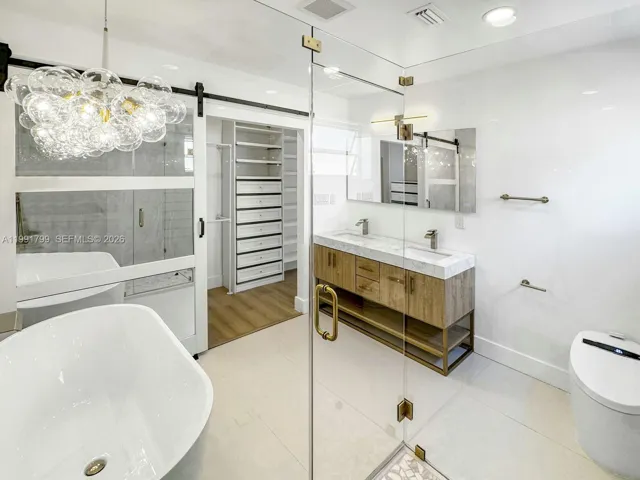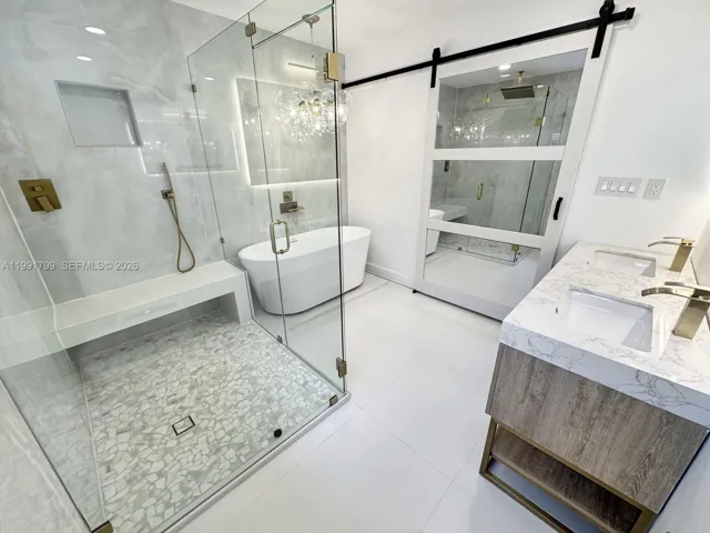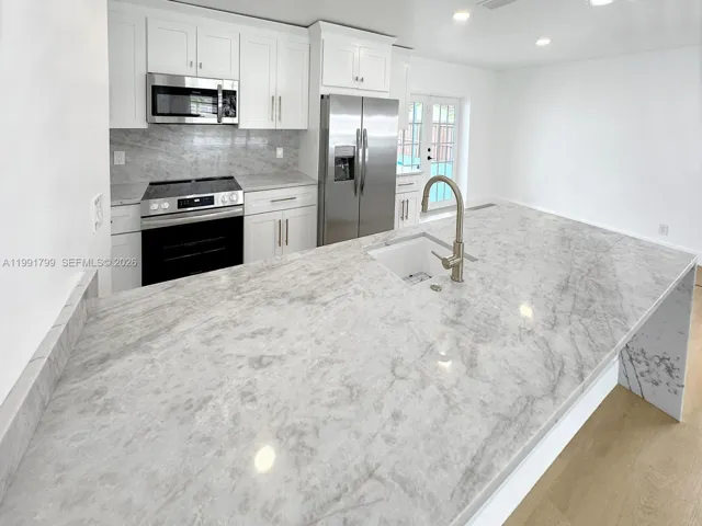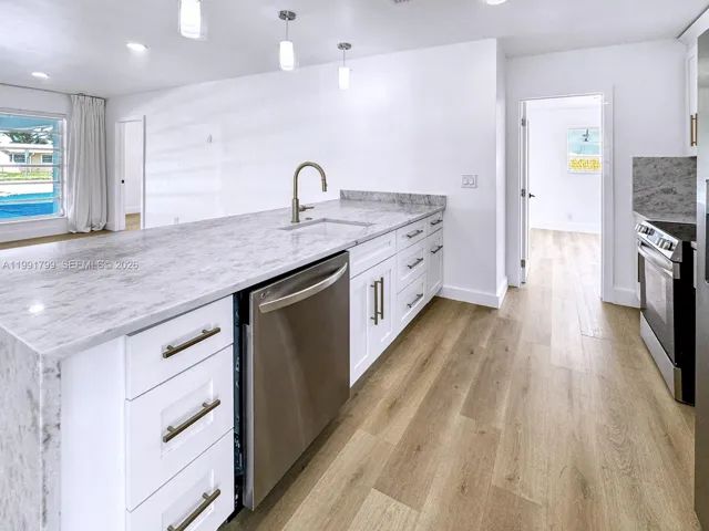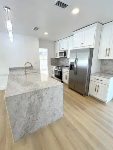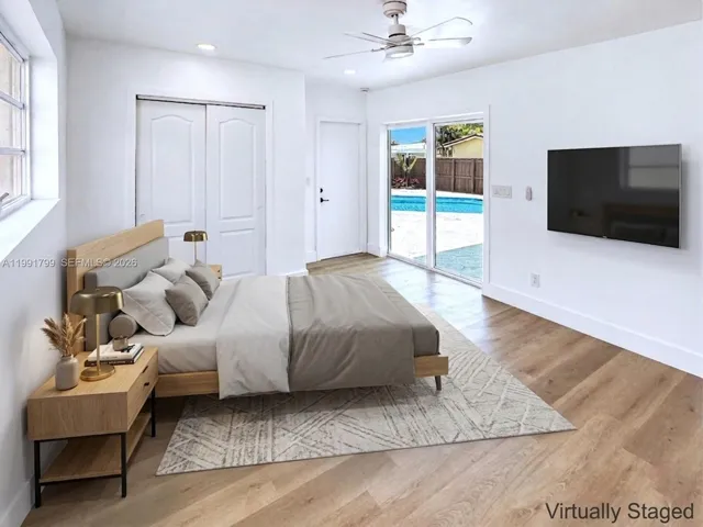 This single family home is located in the Hollywood Hills area and has 3 bedrooms and 2 bathrooms, along with an additional enclosed room that may be used as a 4th bedroom, office, or flex space. The home has been fully remolded and updated with a new kitchen featuring white cabinetry, gold tone hardware, stainless steel appliances, Taj Mahal countertops and a large island. Interior features include new wood style laminate flooring, updated bathrooms, and fresh interior and exterior paint. French doors lead to the patio and pool area, creating a bright and open connection to the outdoor space. The pool has been resurfaced and the pool deck has been updated, for a great backyard to enjoy. Additional features include a new washer and dryer and a circular driveway. All bedrooms, including the primary bedroom have direct patio and pool access with access to the backyard, a walk in closet, and an updated bathroom that will leave you feeling like you are at the spa. No HOA and convenient access to shopping, dining, parks, and is approximately six miles from Hollywood Beach.