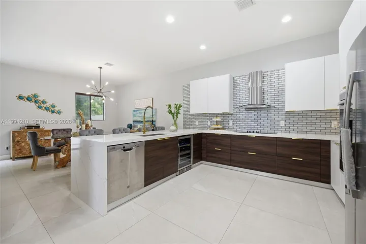 Step into refined South Florida living in this 2020 impeccably designed corner-unit newer construction townhome residence. The open-concept living space is anchored by a show-stopping chef’s kitchen featuring quartz countertops with a dramatic waterfall edge, custom Italian cabinetry, gold hardware, premium stainless steel appliances, and a built-in wine cooler—perfect for entertaining in style. The living area is a true centerpiece, showcasing a striking stacked stone feature wall with a 72” electric fireplace and integrated surround sound, while a designer chandelier defines the dining space. The first level is completed by a stylish powder room and oversized 2-car garage with an epoxy finished floor. Upstairs, the expansive primary suite offers a private retreat with a spacious walk-in closet and spa-inspired bath featuring dual vanities, a soaking tub, and a rainfall shower. Three additional bedrooms, a full bath, and a dedicated laundry room provide plenty of space for everyone. Ideally located in the heart of Dania Beach, just minutes from Dania Pointe, pristine beaches, fine dining, and major highways including Interstate 95, 595, and Florida Turnpike—this home delivers the perfect blend of luxury, lifestyle, and location.