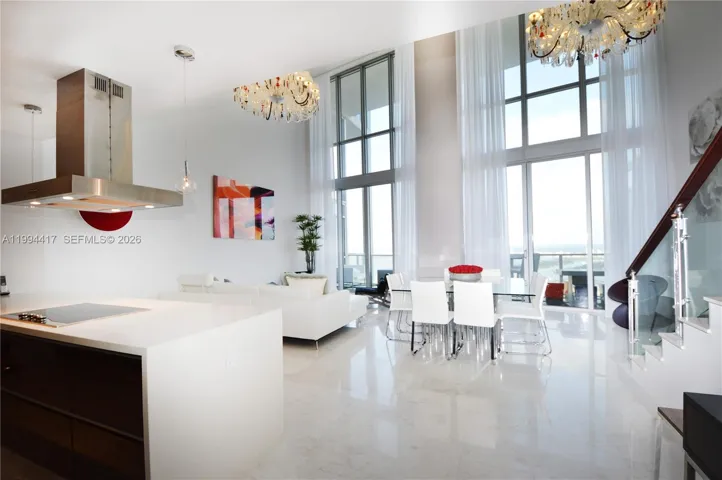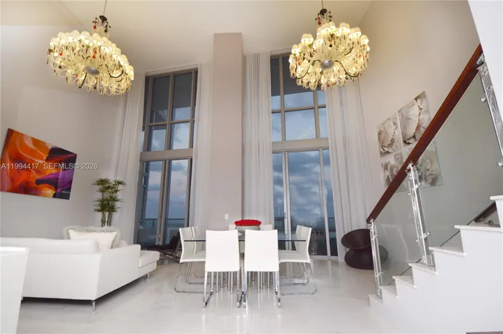 Perched high above Biscayne Bay, Penthouse 6104 at 1100 Biscayne Blvd offers a truly one-of-a-kind floor plan with dramatic 20-foot ceilings and breathtaking direct bay views. This exceptional residence showcases refined design and luxury finishes throughout, including motorized curtains, stunning Baccarat-style chandeliers, elegant glass stair railings, and a spacious in-unit laundry room.