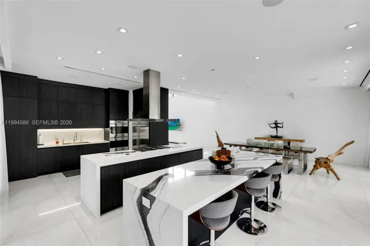Inside the home opens to soaring ceilings and voluminous living spaces flooded with natural light. The chef’s dual waterfall islands kitchen anchors the dining area with an oversize layout and seamless storage spaces that include a walk-in pantry.