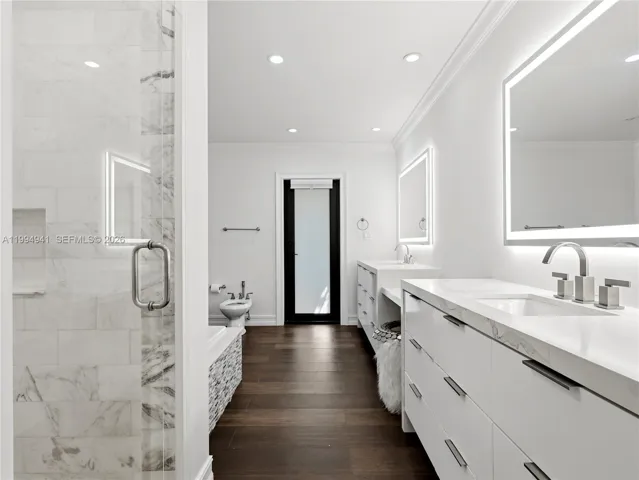 The open main living area connects to a formal dining room overlooking the pool and patio, designed for both daily living and large-scale entertaining. The split floor plan offers true flexibility. The left wing features three bedrooms and two bathrooms, including one en-suite. On the opposite side, a gourmet kitchen opens to a generous family room adaptable as a breakfast nook, office, or playroom. The primary suite includes dual vanities, soaking tub, walk-in shower, and a custom closet.