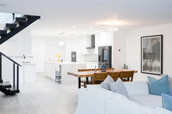 The custom kitchen features WiFi smart appliances and elegant marble countertops. The living room boasts a built-in entertainment center with surround sound speakers, while a dramatic floating stairway leads upstairs.