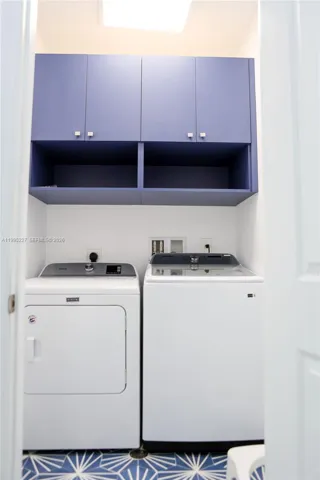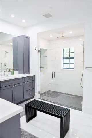 All three bedrooms enjoy private balconies. The master suite is a true retreat with a spa-like bath featuring a rain shower, marble finishes throughout, and spacious California walk-in closets. Additional baths are modern and updated.