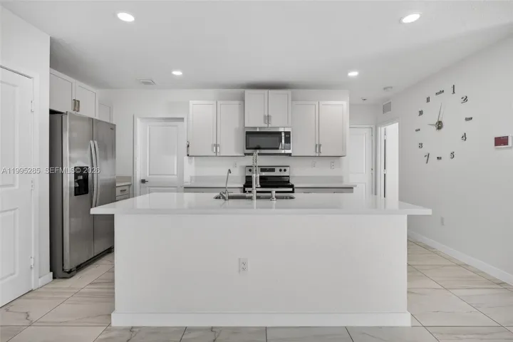 The kitchen is equipped with a large island, pantry, and stainless steel appliances, flowing seamlessly into the main living areas. One bedroom and full bathroom are conveniently located on the first floor, ideal for guests or flexible use.