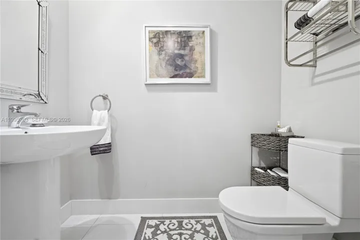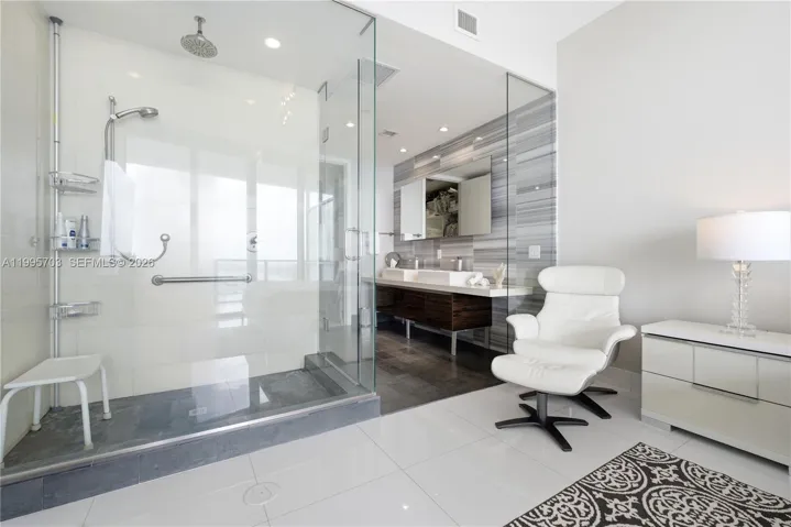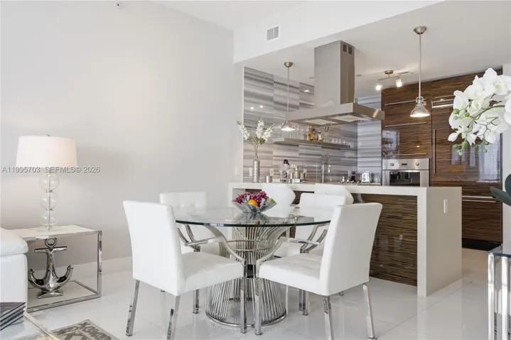 Inside, you will welcomed the 10-foot ceilings, floor-to-ceiling impact windows, and sleek 24×24 white flooring throughout. One of the bathrooms was recently updated with modern floor-to-ceiling tiles and large glass-enclosed shower. Designer-curated finishes elevate every space, including a custom Zebrano kitchen & Viking appliances* FURNITURE INCLUDED * Note the A/C unit was replaced in 2022 & Washer /Dryer in 2026 .
