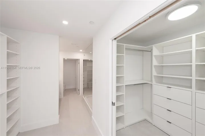 The open kitchen is designed for both functionality and entertaining, featuring a sleek bar, stainless steel appliances, and seamless connection to the main living area. Custom built-in closets have been incorporated across the residence, maximizing storage while maintaining a refined aesthetic.