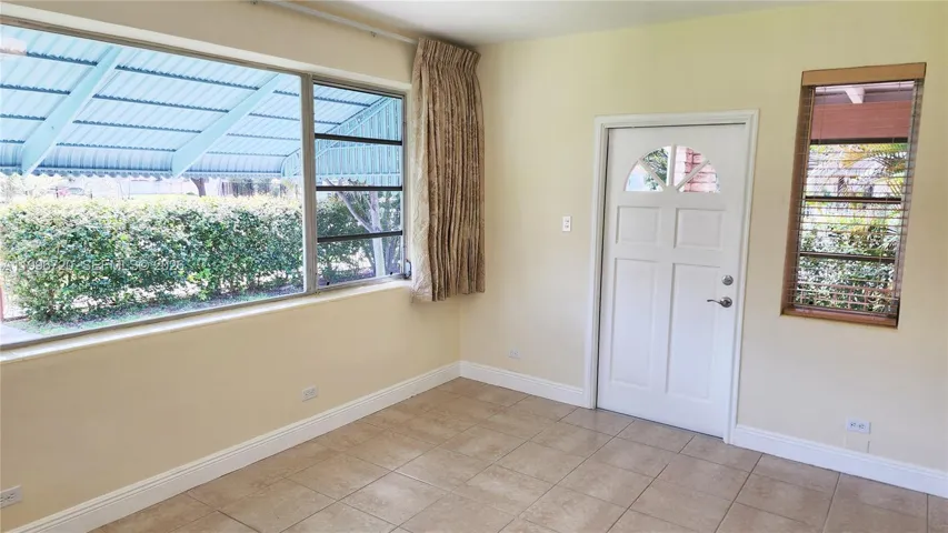 Florida entry room with huge windows, great for office. Livingroom, dining room, newly remodeled bathroom with bathtub, kitchen with original built-in cabinets with rainwater glass inserts, granite countertops, breakfast room. Orig functioning Bahama shutters. Back has converted garage with A/C, functioning automatic garage door, full bathroom, laundry room.