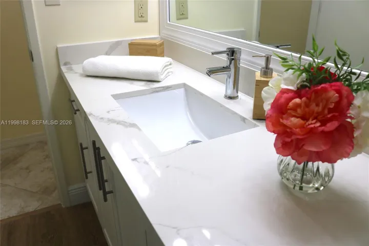 Spacious first-floor corner-unit apartment available in the quiet and well-maintained community of Gardens North. This remodeled residence features new flooring throughout, creating a bright and inviting living space. The updated kitchen offers new white cabinetry, modern countertops, and a convenient pass-through to a separate dining area, ideal for everyday living and entertaining. Enjoy peaceful lake views from both bedrooms and the fully screened-in patio, perfect for relaxing outdoors. The primary bedroom includes a spacious walk-in closet and an updated en-suite bathroom with a walk-in shower, double-sink vanity, and linen closet. The second bathroom features a tub and updated white cabinetry and countertops. Additional features include a full-size washer and dryer in the unit, pantry/storage space, and a utility closet for added convenience. One assigned parking space is located close to the unit entrance, with guest parking nearby. Residents of Gardens North enjoy access to community amenities including a clubhouse with heated pool, fitness center, and tennis courts. One small, well-trained pet welcome with a non-refundable $200 pet fee. Showings will begin the last week of April.