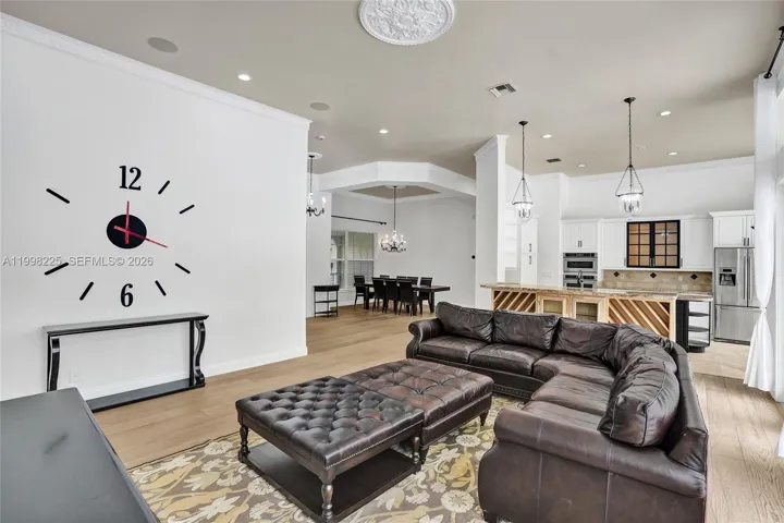 The kitchen features granite countertops, newer SSappliances, ample cabinetry, and a center island that flows seamlessly into the main living and dining areas, ideal for both everyday living and entertaining.