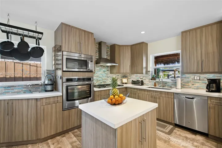 Positioned on a prime waterfront lot with 75 feet of waterfront and no fixed bridges, this property offers direct ocean access via the Intracoastal. Perfect for year-round enjoyment, or unwind beneath the charming tiki hut, an inviting space for entertaining and relaxed South Florida living.