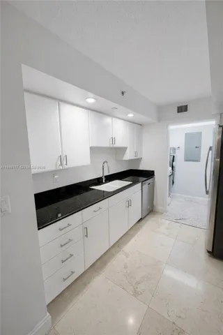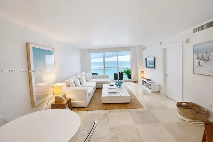 Beautifully updated residence at The Collins, an oceanfront building ideally located in Miami Beach. This bright and inviting unit features a clean, modern design with white cabinetry, stone countertops, and light flooring throughout, creating an open and airy feel. The functional kitchen offers ample storage and stainless steel appliances, seamlessly connecting to a comfortable living area filled with natural light.