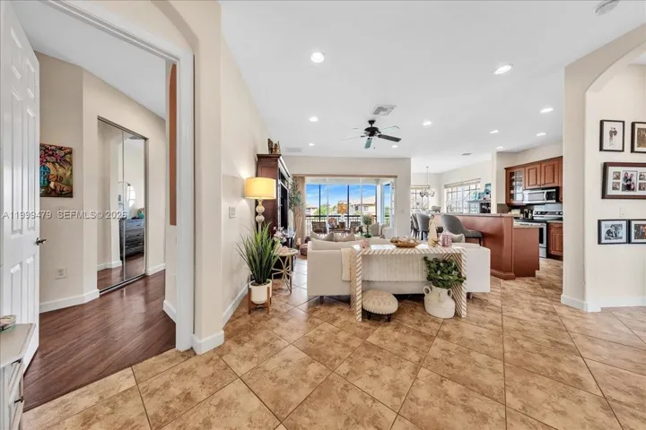 The first photo says everything. That sunset is your view every single evening from your own screened balcony. Welcome to the westernmost address in Parkland. This immaculate second floor coach home in Cypress Pointe IV at Heron Bay lives like a single family residence with a private entry, 1 car garage, and no neighbors above or below your main living floor. The moment you enter the tiled foyer and the panorama opens straight through to the balcony and out to the lake and Everglades you understand this home is different. Vaulted ceilings, diamond cut tile floors, recessed lighting, and an open layout that flows effortlessly from the living room to the formal dining room to the screened balcony. The kitchen features rich wood cabinetry to the ceiling, granite countertops, an angled breakfast bar with seating for four, and brand new stainless steel appliances including a brand new French door refrigerator. The primary suite is its own wing with double door entry, direct balcony access, two oversized closets, and a spa caliber bath with dual vanities, a dedicated makeup station, and a two person travertine walk in shower with dual shower heads and a built in bench. Brand new LG ThinQ stacked washer and dryer. No HOA application required. Lease immediately. A rated schools. Heron Bay resort amenities. $1,500 one time Capital Contribution from Buyer to Heron Bay Master HOA at closing.