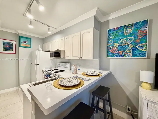 Beachfront living at it’s best! Freshly painted, decorated and updated kitchen counter and backsplash. Bright studio located at The International Studio Condominium, a private beachfront community. Studio is located on the first floor and is overlooking the pool. It is offered fully furnished with a king size Murphy bed, sofa, dresser, bar stools and a television. Kitchen is fully equipped with a refrigerator, range and microwave. Rent includes WIFI, water and electricity. Laundry facilities are located on each floor. One assigned parking space is included. Community is gated and has direct access to the beach.