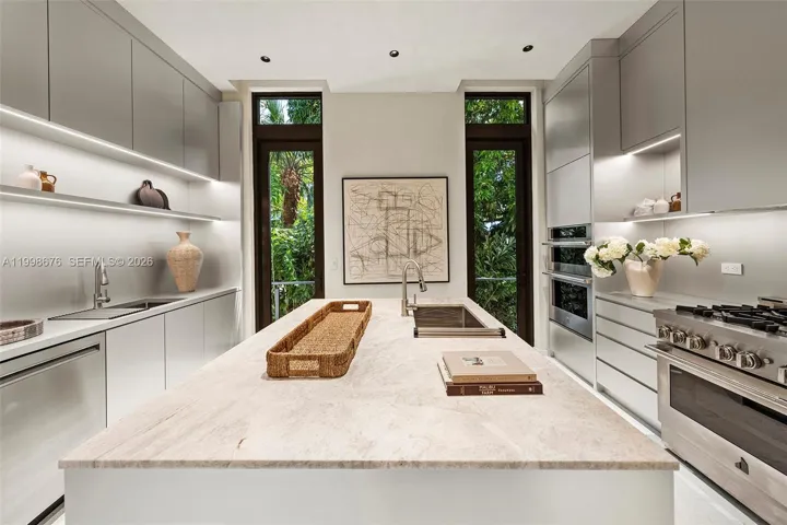 Designed by SDH Studio, with interiors by Alizée Brion and landscape design by CLAD, the home blends refined natural materials with sophisticated modern living. Elevated above FEMA requirements, it features soaring ceilings, dramatic entertaining spaces, custom walnut millwork, shell stone and white oak flooring, limestone accents, Lutron lighting and shade control, Sonos-integrated audio, and seamless indoor-outdoor living.