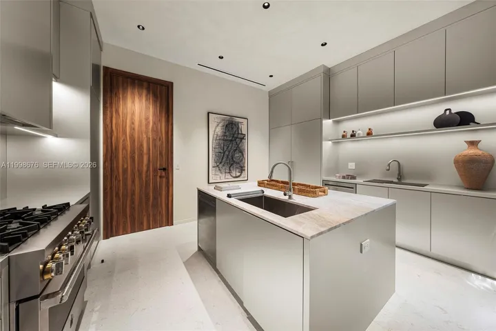 The home includes a stunning main kitchen, fully equipped chef’s kitchen, heated saltwater pool and spa, waterfall feature, outdoor kitchen, lush tropical landscaping, and a spectacular 2,250 SF rooftop terrace with pickleball rendering.