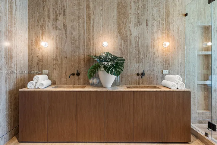 The private upper level is devoted to a serene primary suite with sitting area, spa-like travertine bath, expansive closets, coffee station, and a dedicated wellness suite with sauna and cold plunge.