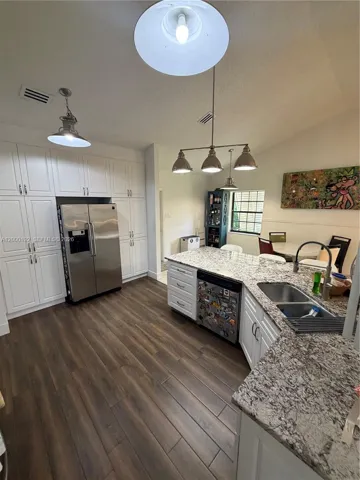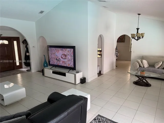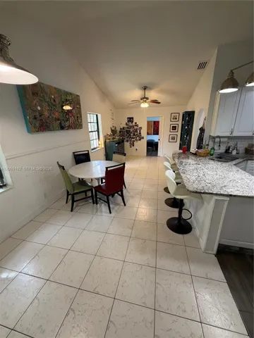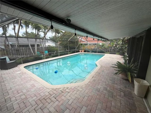 countertops with breakfast area and family room. Kitchen has porcelain tiles that look like wood planks. Social areas are tiled. Laminate floors in bedrooms. Updated bathrooms. One is a cabana bathroom. Enjoy your TRANQUIL outdoor living spaces with screened pool area and additional covered patio with hot tub. Full fenced yard. Water-saving sprinkler system with dedicated deposit. Roof is 2018 / AC 2021 / Tankless water heater from 2025 / new washer & dryer. Other added features include updated interior electrical panel, partial hurricane accordions, oversized driveway with ample parking. Additional workshop/shed on side of home. Owner in home. Showassist for appointment.