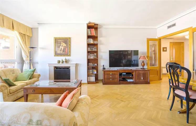 €960,000 EUR. Elegant 3 bedroom, 2.5 bath residence in the prestigious gated community of Prado de Somosaguas, Madrid. Offering 2,271 SF of living space, this bright and spacious home features a gracious entry hall, expansive living and dining room with fireplace, and access to a private terrace overlooking the beautifully landscaped grounds. The large south-facing kitchen includes a breakfast area and separate laundry room. The primary suite offers a walk-in closet and en-suite bath, while two additional bedrooms share a full bath. Includes 2 covered parking spaces and a large storage room. The community offers 24/7 security, pool, gardens, paddle and basketball courts, playground, clubhouse and dressing rooms. Located in one of Madrid’s most exclusive residential areas.