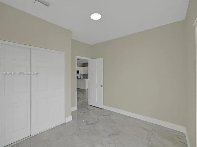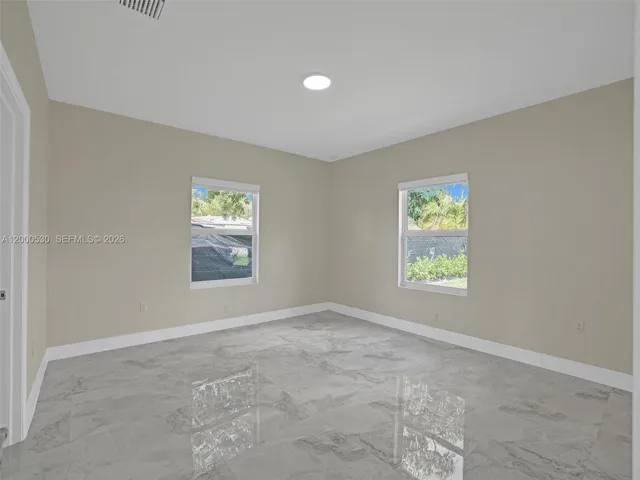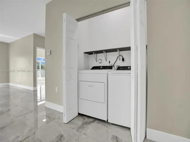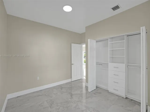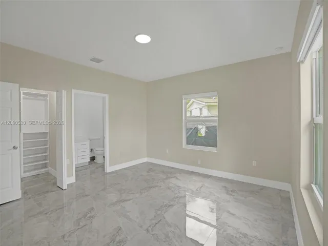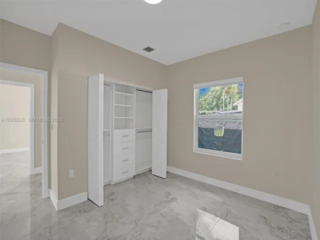 have porcelain tiles and modern fixtures. Split bedroom layout with custom-finished closets. Impact doors and