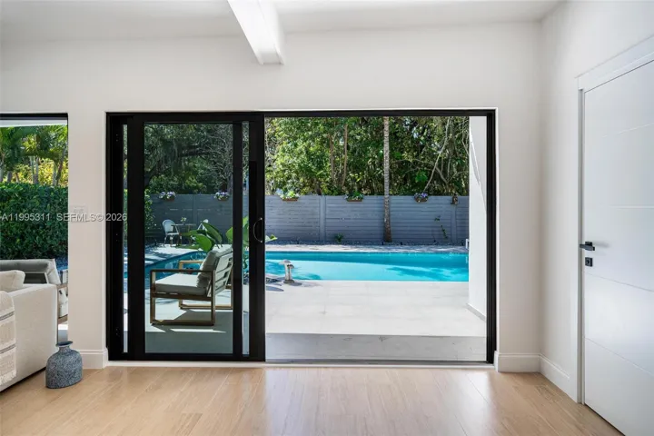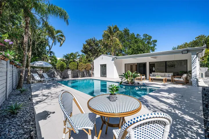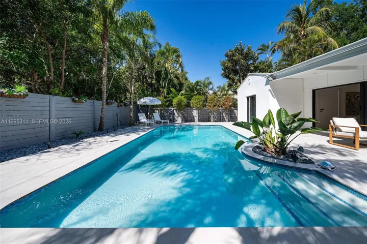 Step outside to a lush private backyard with a pool, perfect for relaxing or entertaining.